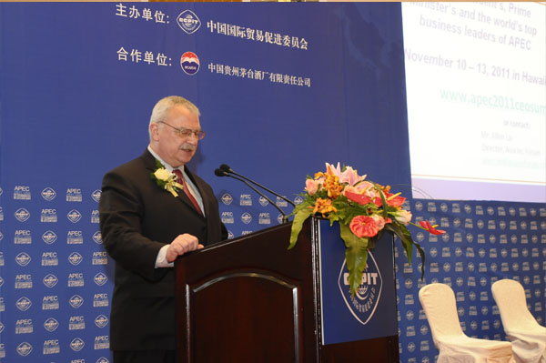 4月25日晚,应美国APEC组委会邀请,中国国际贸易促进委员会在北京中国大饭店隆重主办 “2011年美国夏威夷工商领导人峰会招待宴会”。中国贸促会副会长于平、中国APEC高官、外交部国际司副司长庞森、中国APEC发展理事会理事长、亚太经合组织工商咨询理事会(ABAC)中国代表、第一视频董事局主席张力军,ABAC中国代表、轩辕集团董事长杨云松,ABAC候补代表、中粮集团董事长宁高宁、茅台集团董事长季克良等中国工商界人士出席了晚宴。