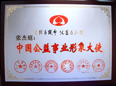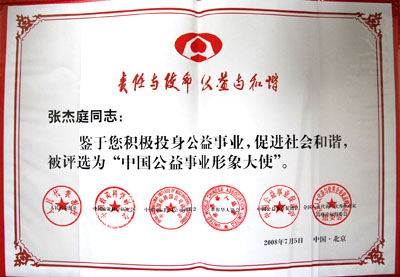 Due to his active participation in public welfare undertakings and promotion of social harmony, Mr. Zhang Jieting was selected as “China's Public Welfare Image Ambassador” by Renmin Daibiao Bao, China Society for Policy Study, China International Institute of Multinational Corporations, United World Chinese Association, China Public Welfare Promotion Association, the organizing committee of Summit Between Deputy to the National People's Congress and Outstanding Entrpreneurs.