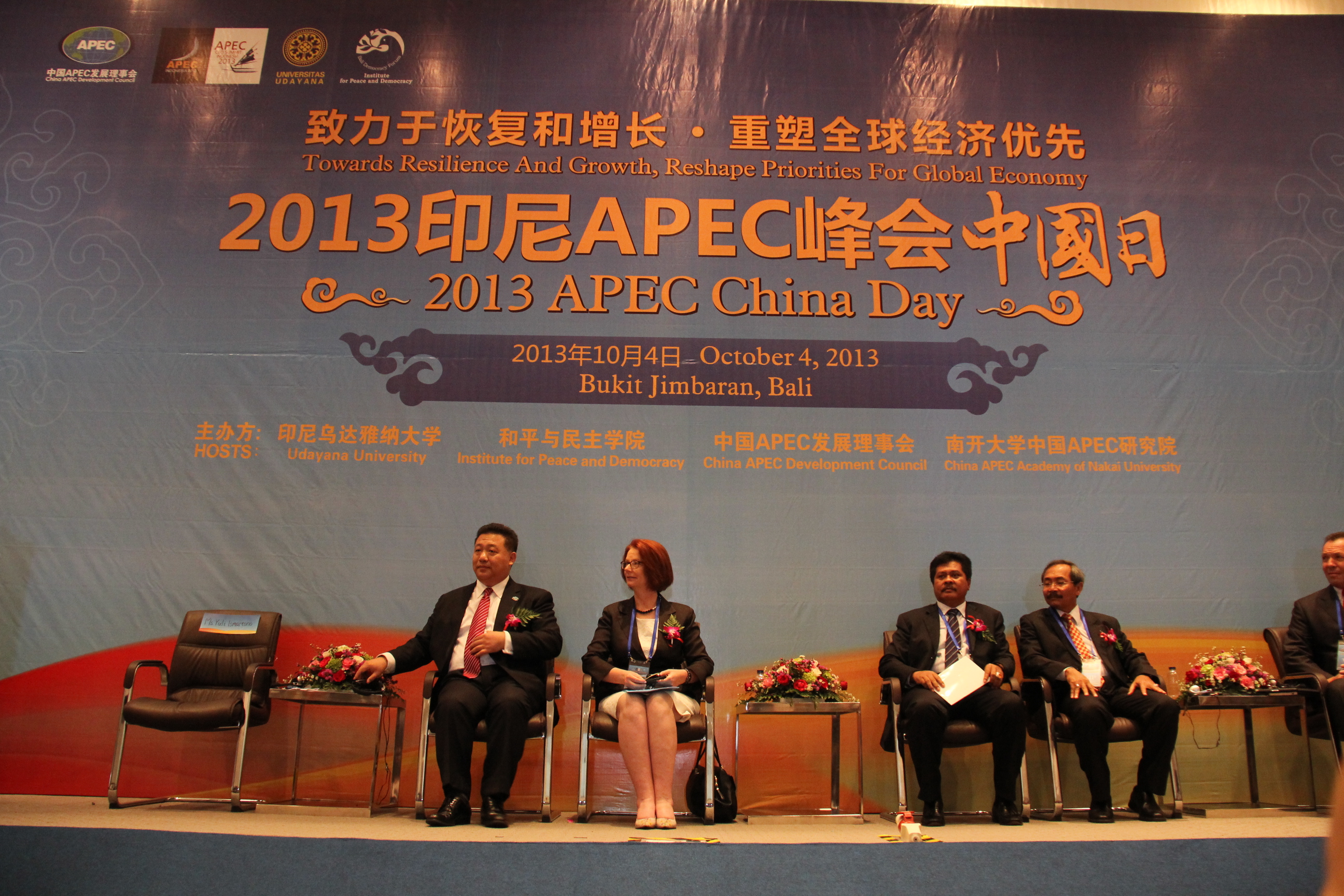 为了推动APEC经济体间的经济、文化、民间相互交流,促进中国与举办APEC峰会东道主间的相互了解,中国APEC发展理事会在今年APEC峰会举办前夕,即2013年10月4日与印尼巴厘岛乌达雅纳大学和平民主学院及南开大学中国APEC研究院联合主办了APEC“中国日”活动。澳大利亚前总理吉拉德、中国APEC发展理事会理事长张力军在中国日发表了主题演讲,印尼巴厘省副省长苏里巴塔、乌达雅纳大学校长苏斯阿托博士、美国财经专家索斯沃斯分别作了专题演讲。中国驻印度尼西亚泗水总领馆总领事王华根、中国参加APEC 工商领袖峰会的代表和理事会的代表、美国、加拿大、澳大利亚、新西兰、泰国、印尼等经济体的工商领袖代表、印尼乌达雅纳大学和和平民主学院以及一所高中的学生代表、中国在乌大的留学生代表和印尼巴厘岛华商会主席及代表等300多人参加了“APEC中国日”活动。通过此次举办“APEC中国日”活动,我们有如下几方面的体会: