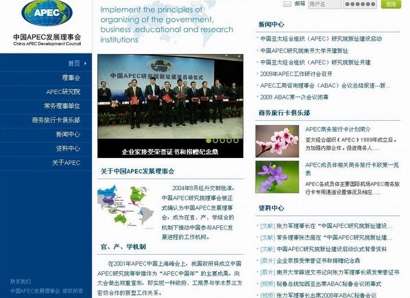 该网站自筹建以来,受到各有关方面的关注。网站由关于中国APEC发展理事会,官、产、学机制,新闻中心,商务旅行卡俱乐部,资料中心等五大版块组成。网站内容从理事会工作的不同视角,进行了全面介绍和报道。网站结构简洁大方,图文并貌便于阅读。