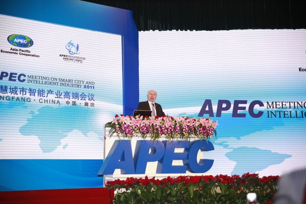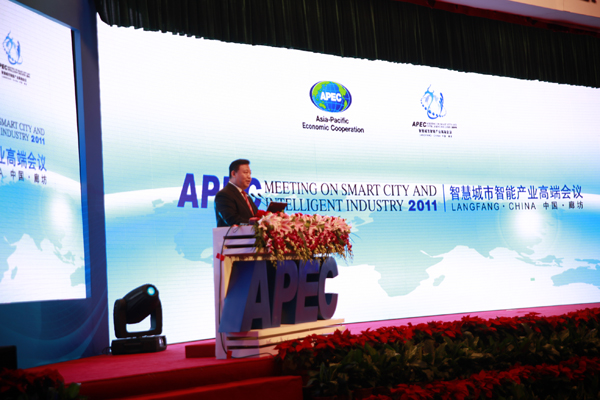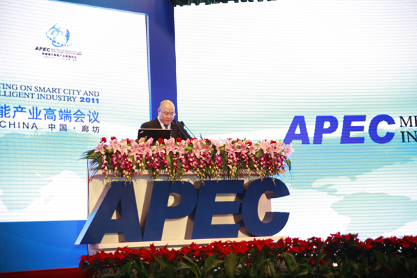 第二届“亚太经济合作组织(APEC)智慧城市智能产业高端会议”于2011年5月18-19日在中国河北省廊坊市隆重召开。本届高端会议由中国APEC发展理事会主办,廊坊市人民政府、河北省商务厅及河北省人民政府外事办公室承办,中国APEC研究院和百川能源集团共同协办。本次会议的召开获得了中国外交部、中国人民对外友好协会、中国国际友好城市联合会、中国APEC研究院等有关部门及组织的大力支持。全国政协副主席、全国工商联主席黄孟复、河北省省长陈全国、中华人民共和国外交部副部长李金章,APEC发展理事会理事长张力军,澳大利亚前总理约翰•霍华德,APEC国际秘书处首席运营官沈之永,新加坡规划之父刘太格,世界智能城市评审团主席约翰•荣格等来自APEC各成员的政府首脑、世界知名企业负责人以及著名专家学者齐聚中国廊坊,就智慧城市建设和智能产业开发问题掀起了新一轮的智慧碰撞和头脑风暴。