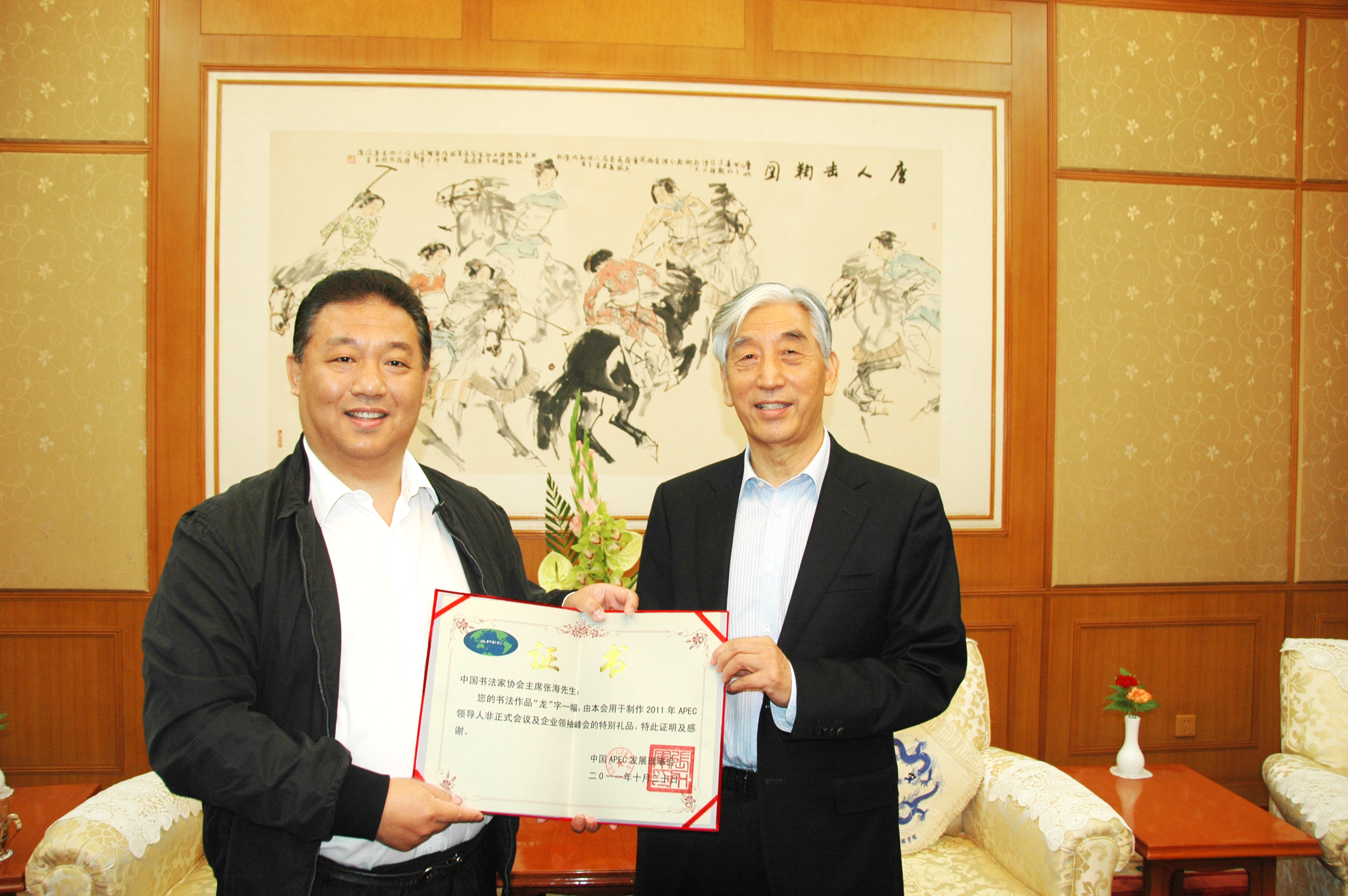 中国APEC发展理事会理事长张力军先生向张海主席颁发证书。